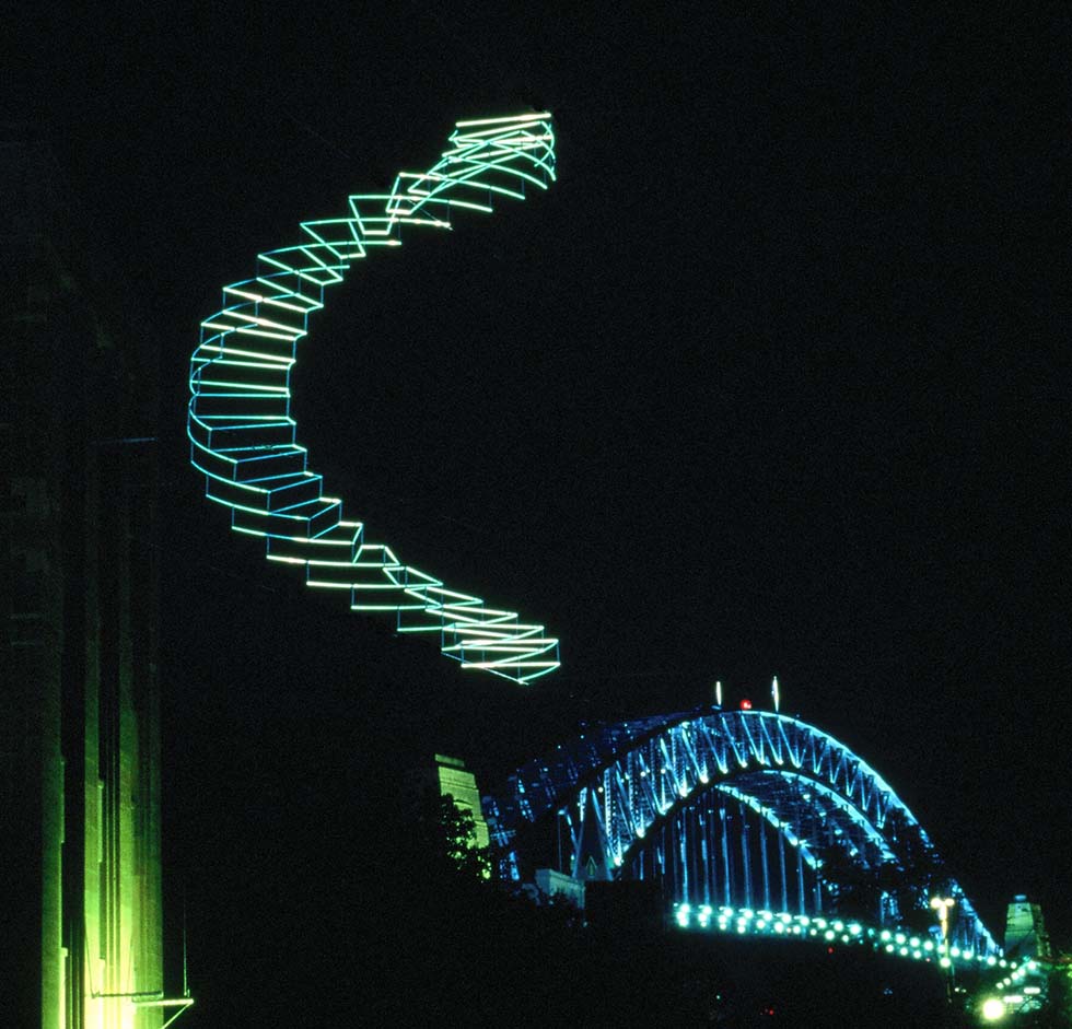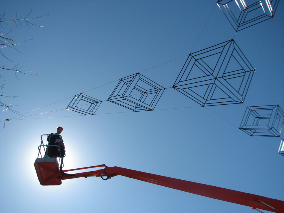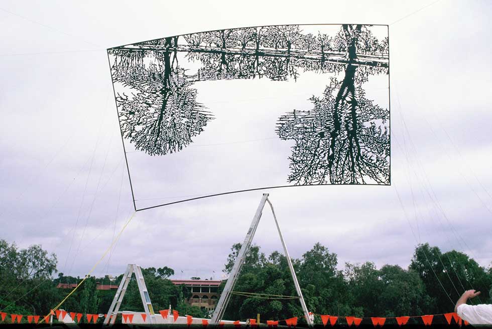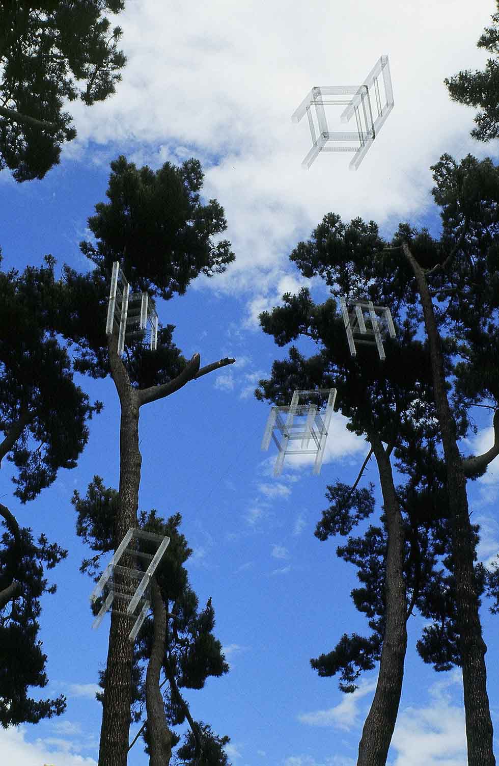 Neil Dawson (Nueva Zelanda, 1948) es un artista inusual, usa la escultura para dibujar en el espacio valiéndose del volumen para enseñarnos el vacío, empleando las tres dimensiones para figurar una bidimensionalidad óptica. Heredero de Hescher (Países Bajos, 1898) en cuanto a las propiedades ilusorias de la perspectiva Dawson interviene el espacio con el mismo sentido lúdico que el artista Holandés, usando el cielo o el paisaje como el telón de fondo de una viñeta donde la escultura transforma, momentáneamente, la realidad en un «cartoon», en un juego imposible fondo-forma. La utilización del moaré producido por el entrelazado de las mallas de acero que utiliza para representar los niveles de grises que tendría una ilustración plana, el recorte casi origámico de sus piezas, el patrón modular (nuevamente Hescheriano) de sus mini esculturas, confieren a su obra un encantamiento propio del universo literario de Lewis Carroll, un universo que necesita la naturaleza como modelo para, enfrentándola al espejo del arte, mostrarnos el rostro imposible que oculta.