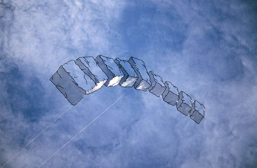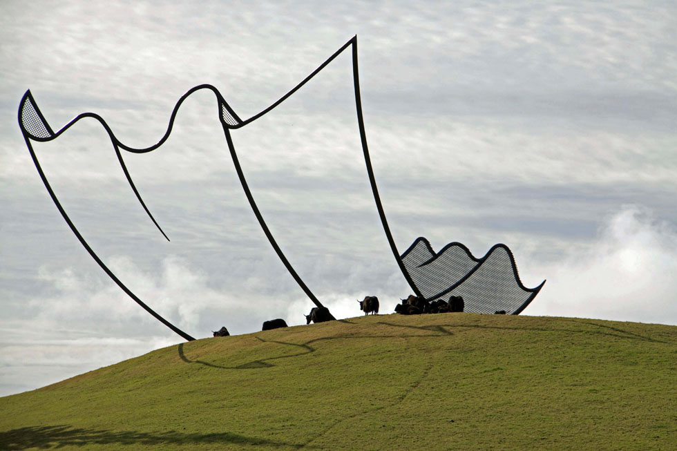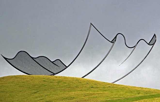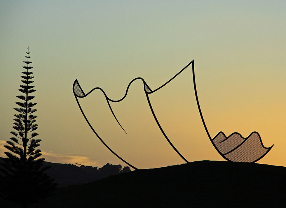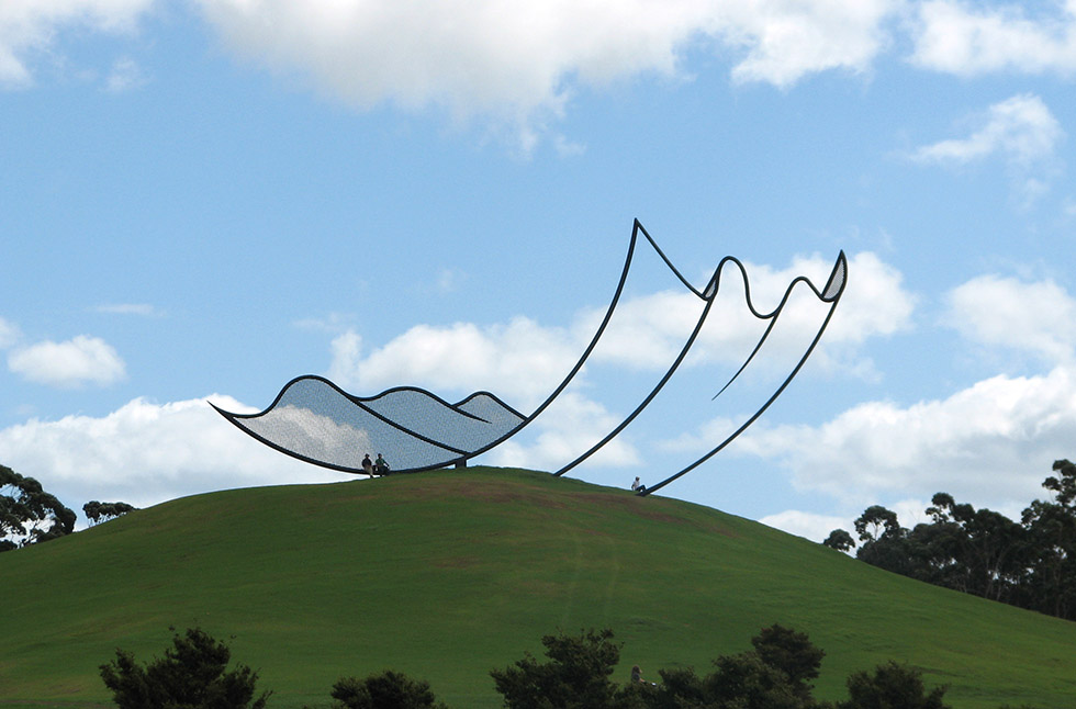 Una de sus esculturas que más impacto tiene en la retentiva es “Horizons” (1994). Esta ilusión de un papel ondulado sobre la colina se encuentra en la bahía de Kaipara en Nueva Zelanda, en ese magno y maravilloso proyecto escultórico llamado Gibbs Farm, al cual volveremos con frecuencia en este espacio para conocer la ingente colección de artistas y obras que lo pueblan.