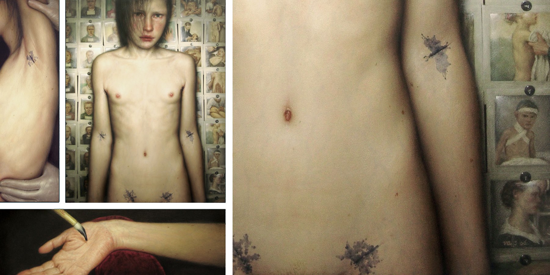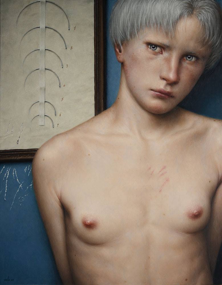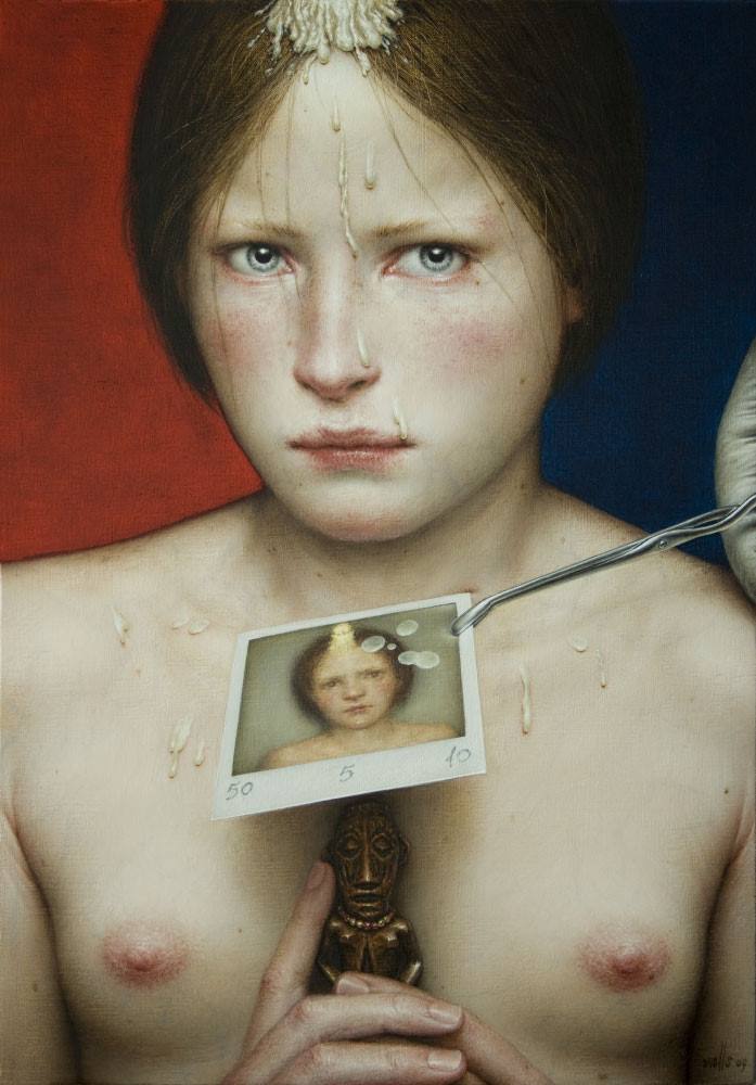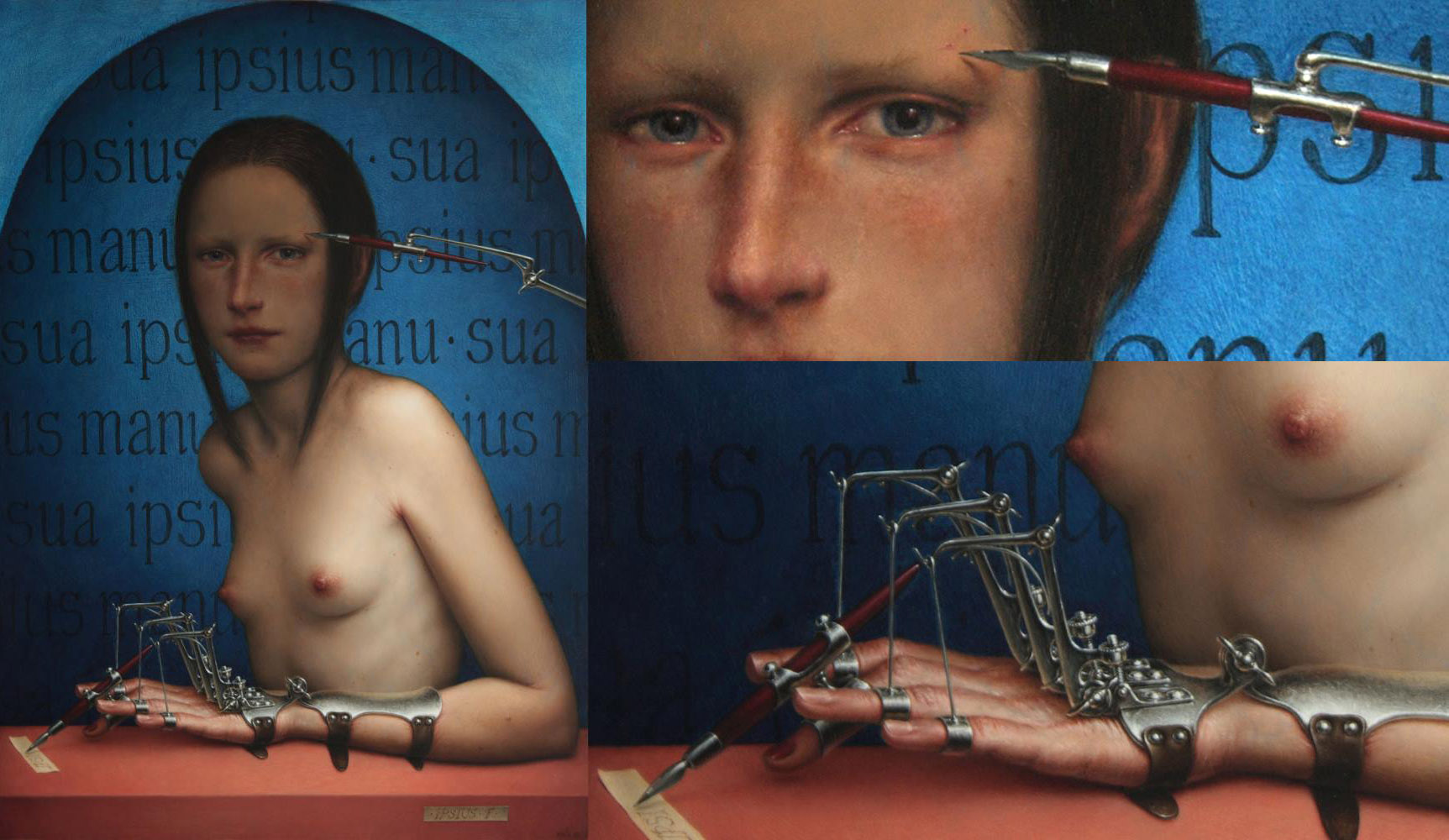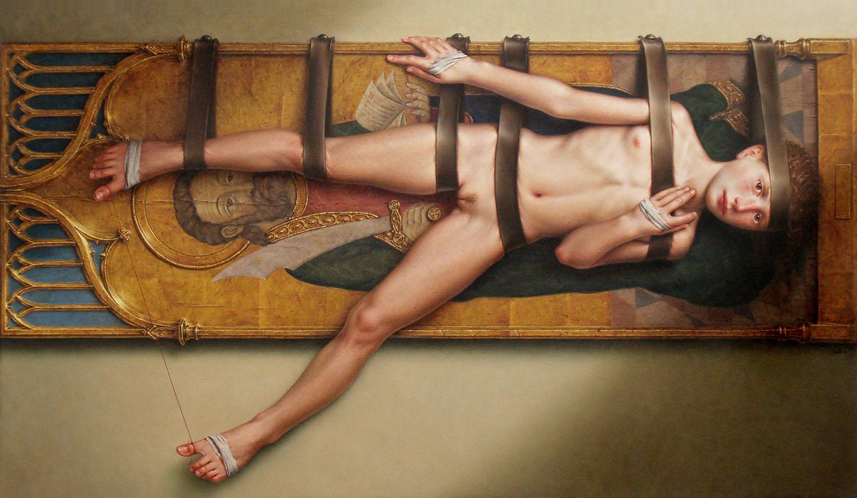 A Dino Valls no se lo considera un pintor realista (amén de su hiperdetallismo), Valls es un pintor figurativo, pinta de memoria y nunca usa un modelo, y quizá ése es el origen de lo inquietante en su trabajo: el rostro y el cuerpo de su única protagonista. Una ninfa habita en la cabeza del pintor y éste le permite materializarse, aunque enjaulada, en su pintura. Más de veinte años pintando a una criatura casi andrógina, atrapada —o detenida— en esa etapa de transformación en que el sexo del ser humano es un bosquejo de su psiquis. Sabemos que es una hembra por la insipiencia de sus pechos y sus genitales, pero su mirada y su gestualidad maniquea nos advierte de un estado aún inacabado, larvario, quimérico. Es igual si esa criatura representa un varón, la sensación de ambigüedad es igualmente inevitable… como inevitable es no sentirse incómodo ante esa mirada suplicante y anodina que implora ser rescatada de las torturas impuestas por el cuadro, y no sólo por los objetos de tortura representados en el lienzo, sino por ¡el cuadro en si mismo!, por la presión de sus marcos y ángulos, por las bisagras, puertas y retablos, por la viciada atmósfera de la luz, por la pesada antigüedad de su paleta cromática y por la elaboradísima arquitectura compositiva de verticales y diagonales con las que Valls lleva atravesando el cuerpo de su musa niña por años.