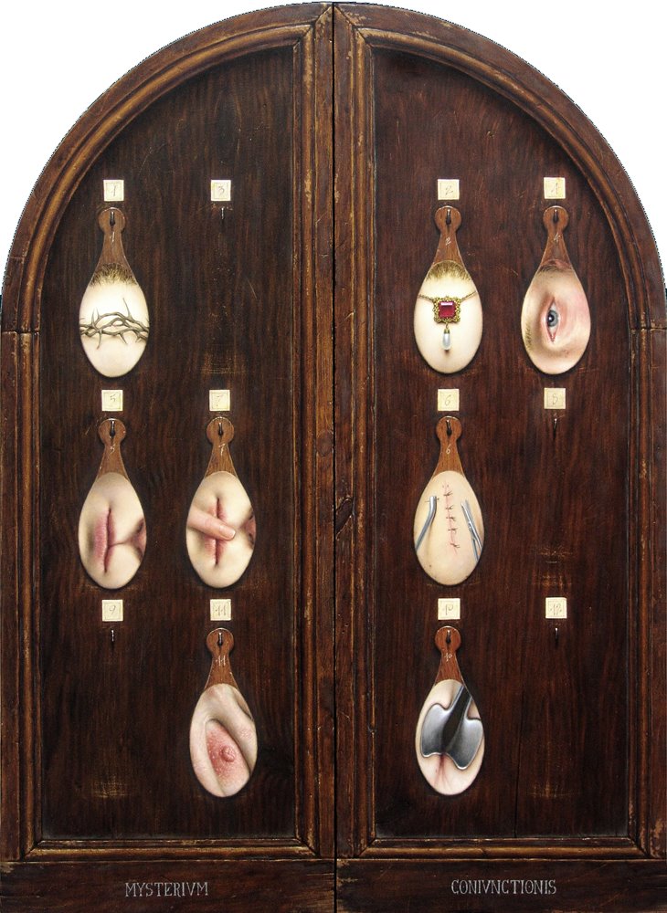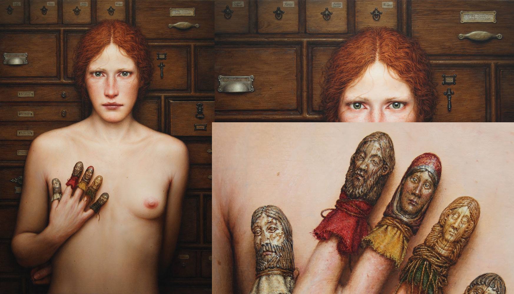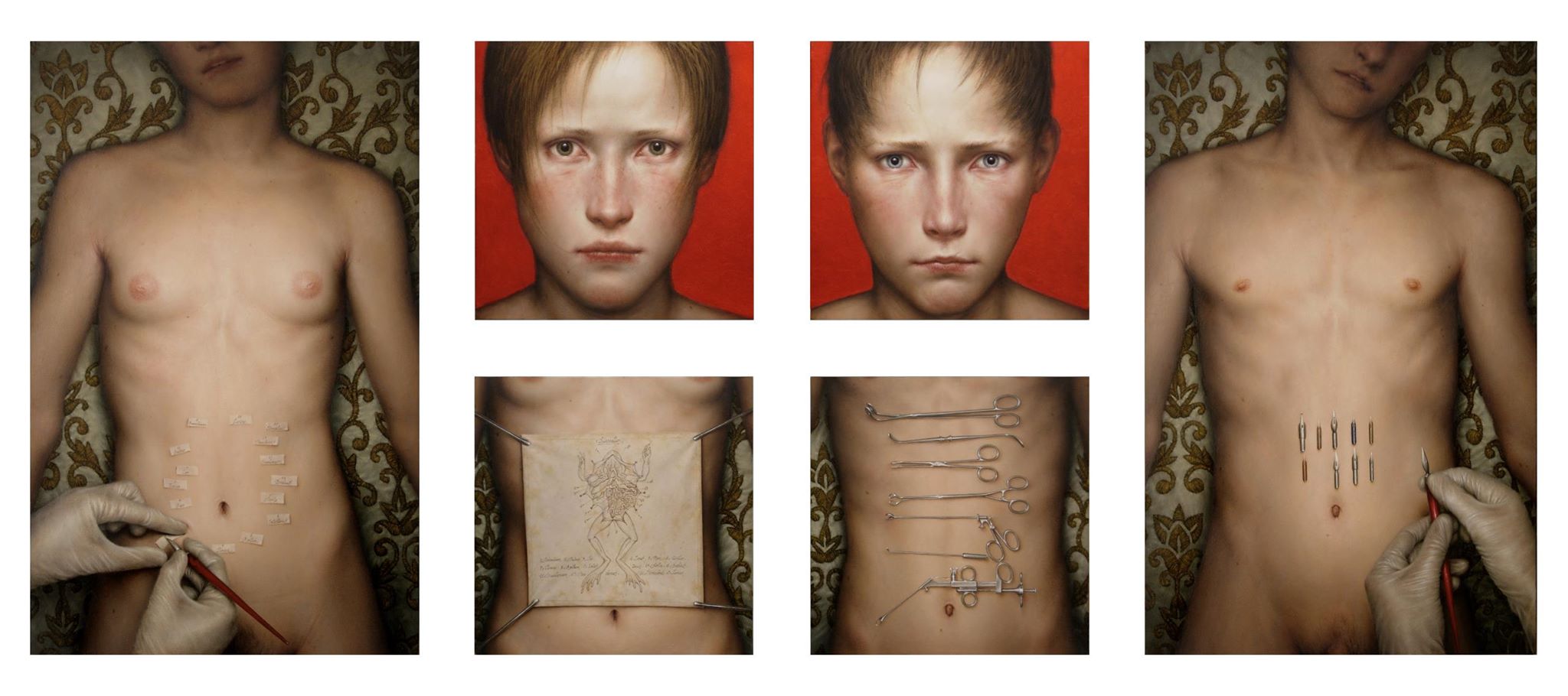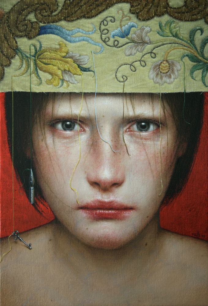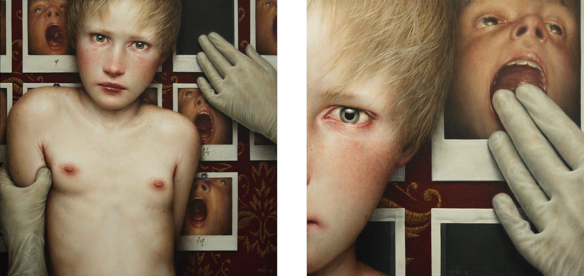 A Dino Valls no se lo considera un pintor realista (amén de su hiperdetallismo), Valls es un pintor figurativo, pinta de memoria y nunca usa un modelo, y quizá ése es el origen de lo inquietante en su trabajo: el rostro y el cuerpo de su única protagonista. Una ninfa habita en la cabeza del pintor y éste le permite materializarse, aunque enjaulada, en su pintura. Más de veinte años pintando a una criatura casi andrógina, atrapada —o detenida— en esa etapa de transformación en que el sexo del ser humano es un bosquejo de su psiquis. Sabemos que es una hembra por la insipiencia de sus pechos y sus genitales, pero su mirada y su gestualidad maniquea nos advierte de un estado aún inacabado, larvario, quimérico. Es igual si esa criatura representa un varón, la sensación de ambigüedad es igualmente inevitable… como inevitable es no sentirse incómodo ante esa mirada suplicante y anodina que implora ser rescatada de las torturas impuestas por el cuadro, y no sólo por los objetos de tortura representados en el lienzo, sino por ¡el cuadro en si mismo!, por la presión de sus marcos y ángulos, por las bisagras, puertas y retablos, por la viciada atmósfera de la luz, por la pesada antigüedad de su paleta cromática y por la elaboradísima arquitectura compositiva de verticales y diagonales con las que Valls lleva atravesando el cuerpo de su musa niña por años.