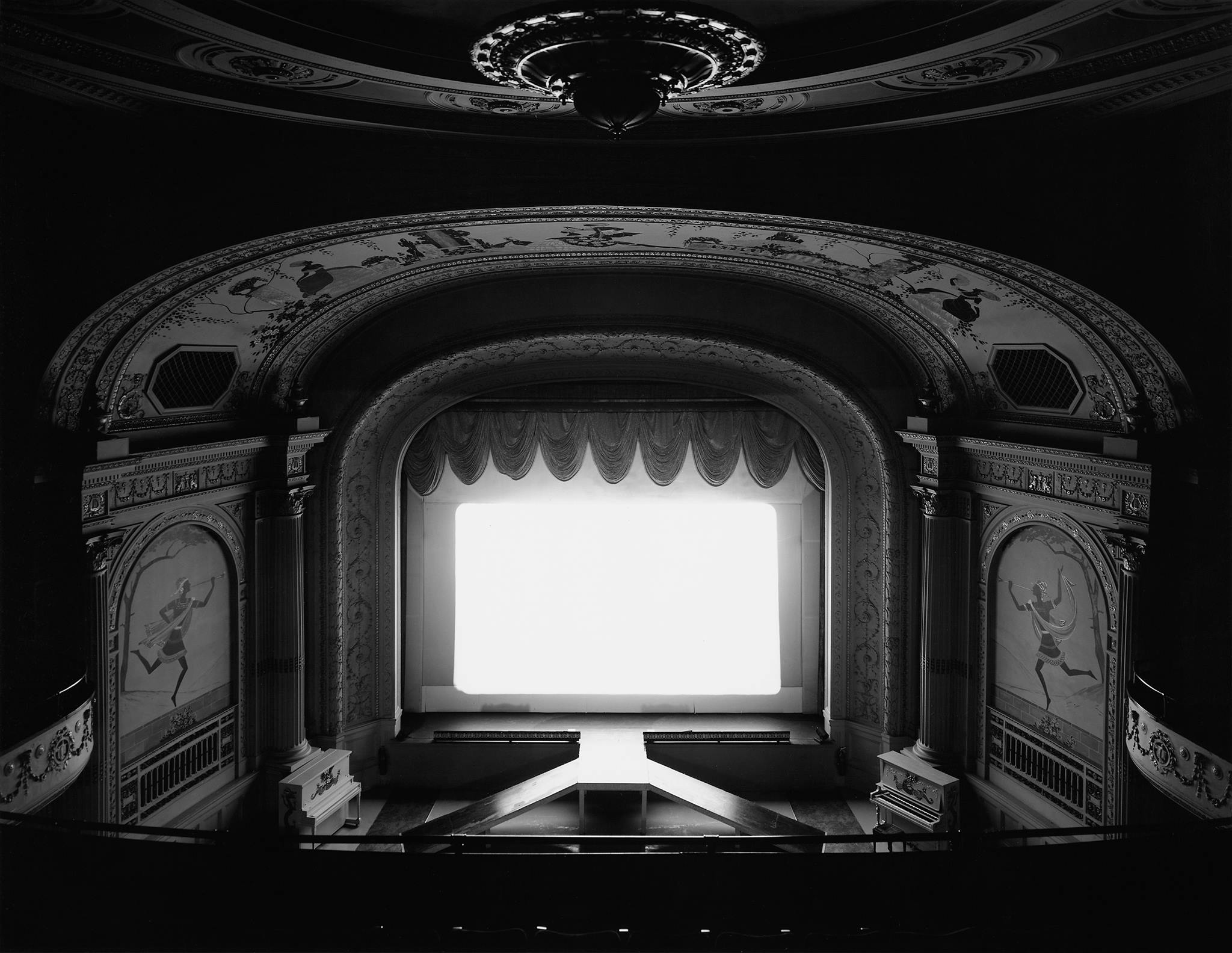 El segundo trabajo, fascinante en su concepto como en su ejecución, es “Theaters”, una serie de fotografías que Sugimoto hizo en los viejos teatros donde se exhibían películas tanto al aire libre como en lujosas y vetustas salas. Utilizando placas de 4×5 de bajísima sensibilidad Sugimoto mantenía abierta la exposición de la placa el mismo tiempo que duraba la proyección del film en la pantalla del teatro. El resultado hacía que la pantalla se transformara en una ventana de luz que iluminaba la platea, las sillas y el espacio vacío, pues los espectadores, o cualquier elemento en movimiento, desparecían en exposiciones de tan larga duración. Si en “Portraits” pretendía la atemporalidad en el estatismo, en “Theaters” buscaba la inmaterialidad en lo cinético. Todo aquello que cambia y evoluciona no se registra, es sólo una ventana en el tiempo (¿iluminando el vacío?), la luz sólo registra aquello que permanece, sea en una fracción de segundo o en toda la historia, y esto atañe tanto a esos espectadores que, al moverse, han desaparecido, como a esas antiguas salas que, al no evolucionar, están destinadas a desaparecer.