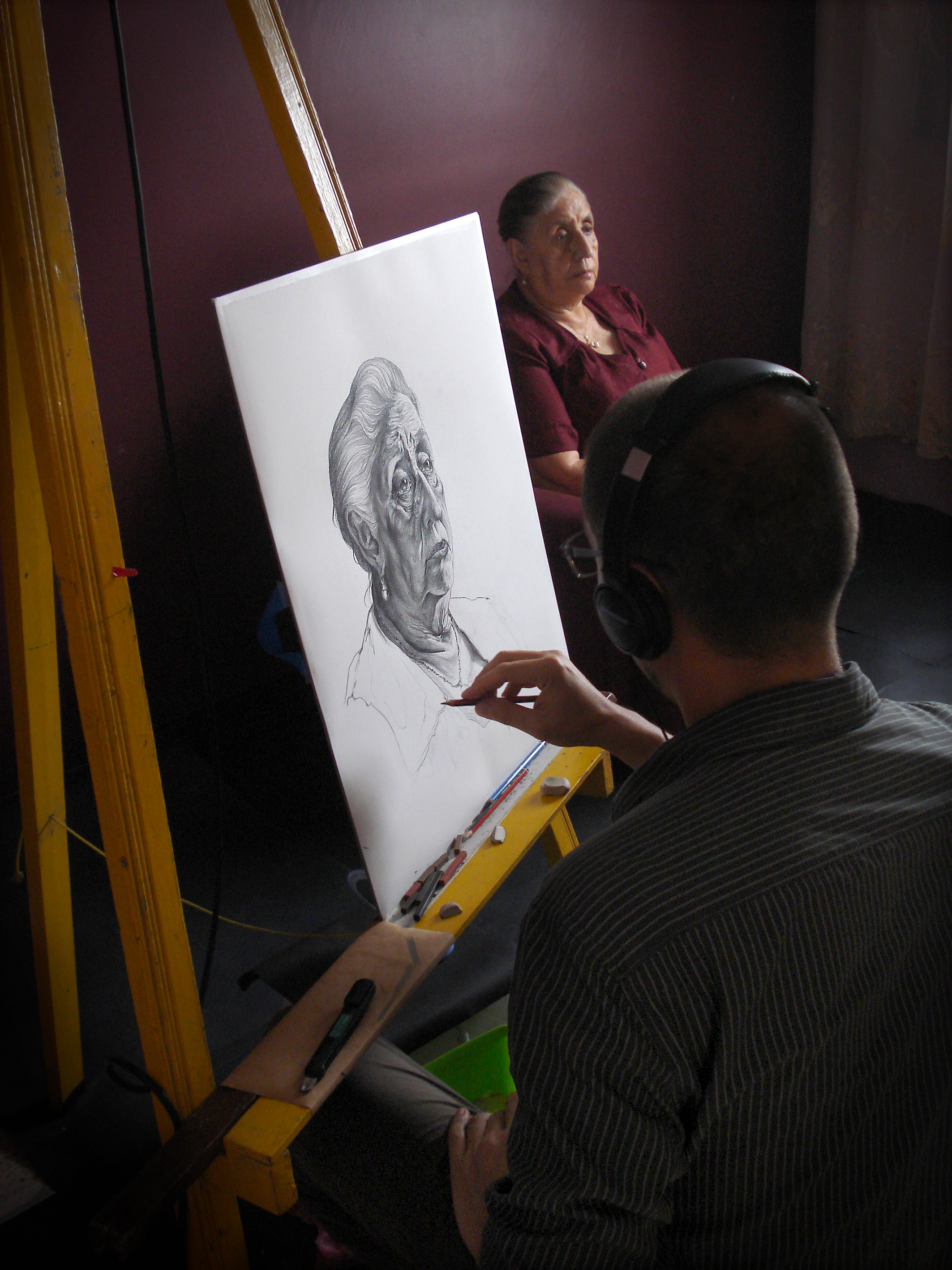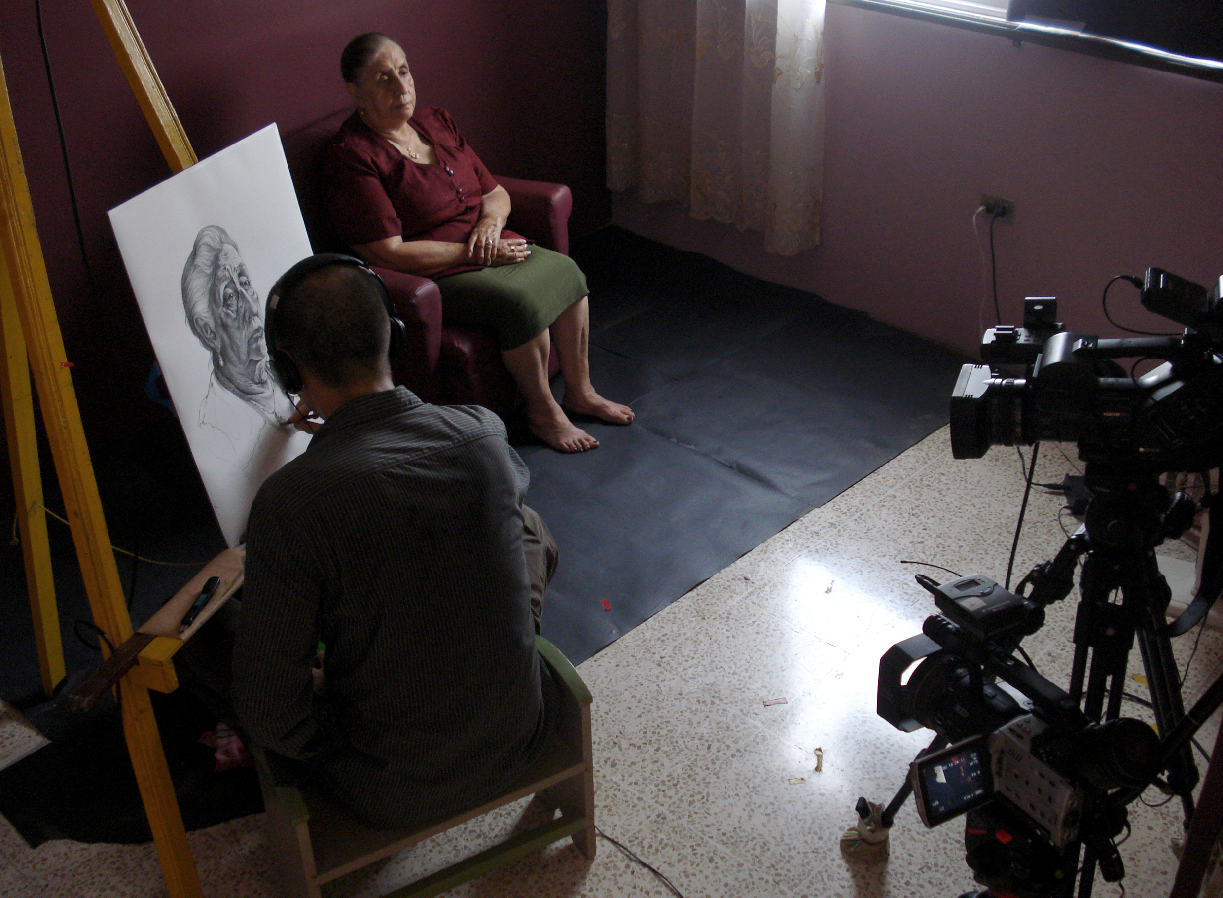 Años atrás, cuando estudiaba la carrera de diseño, había hecho un retrato a lápiz de mi viejo y pensé que, hacer un retrato en vida de mi madre a pocos meses de la muerte de papá, podía ser una buena forma de empezar el documental. Para ello me propuse algo que era una especie de terapia grabada, una terapia que nos ayudó a mi madre y a mi a entender y superar la muerte del viejo. Esa terapia consistía en dibujar en tiempo real a mi vieja mientras la entrevistaba sobre su vida, su niñez, su matrimonio y su estado de viudez. Para grabar ese retrato viviente utilicé dos cámaras, las cuales operaba al mismo tiempo que dibujaba. Una cámara grababa el desarrollo del dibujo y la otra registraba las historias que mi vieja me contaba. El proceso —qué duró 6 días— fue arduo y extenuante, tanto para ella como para mi. Lo hacíamos un par de horas al día, por las mañanas, luego bajábamos a comer y no hablábamos más del tema hasta el día siguiente. Requería la atención y la entrega absoluta de ambos. Mientras ella hacía un profundo ejercicio de hurgar en su memoria yo debía mantener la máxima concentración para captar sus expresiones e intentar plasmarlas en el dibujo, pero a la vez debía prestar mucha atención a aquellas fascinantes y dolorosas historias que mi madre me iba develando, para así poder conducir sus emociones durante la entrevista que luego pretendía editar.