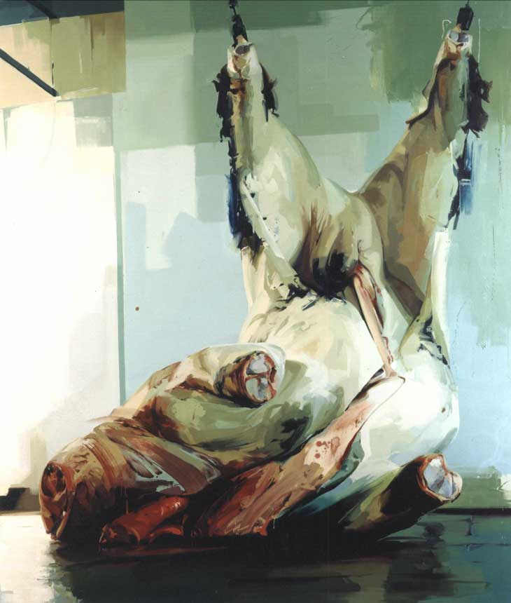 Saville debuta en el 92 con sus tremendos desnudos de mujeres gordas que parecen derramarse en sus telas de gran formato. En la obra de Saville la carne (humana o animal) parece renunciar a su armazón, renegar de ella, negarla. En los cuerpos de Saville la armazón que sostiene la carne representa su cárcel, y por cárcel Saville entiende represión y dominio. El esqueleto invisible que soporta los pesados volúmenes femeninos es un exoesqueleto, quizá incluso un metaexoesqueleto, en el cual la estructura que apuntala la grasa es análoga a la arquitectura estética de un tiempo que tiene atrapado al individuo en sus cánones de belleza. Esa represión en el caso específico de la mujer, obesa, carnosa, hiperreal, constituye el dominio imperante de la visión masculina sobre la que se asienta el ideal contemporáneo de la belleza femenina. La carne en Saville es el cuerpo del cuadro, su continente y su contenido. La artista nos exulta a mirar la convención de lo grotesco para hallar lo bello más allá de la vergüenza del canon; un canon fraudulento y cobarde que teme enfrentar la maravillosa corrupción del cuerpo y su inexorable mortalidad como condiciones capitales de la existencia.
